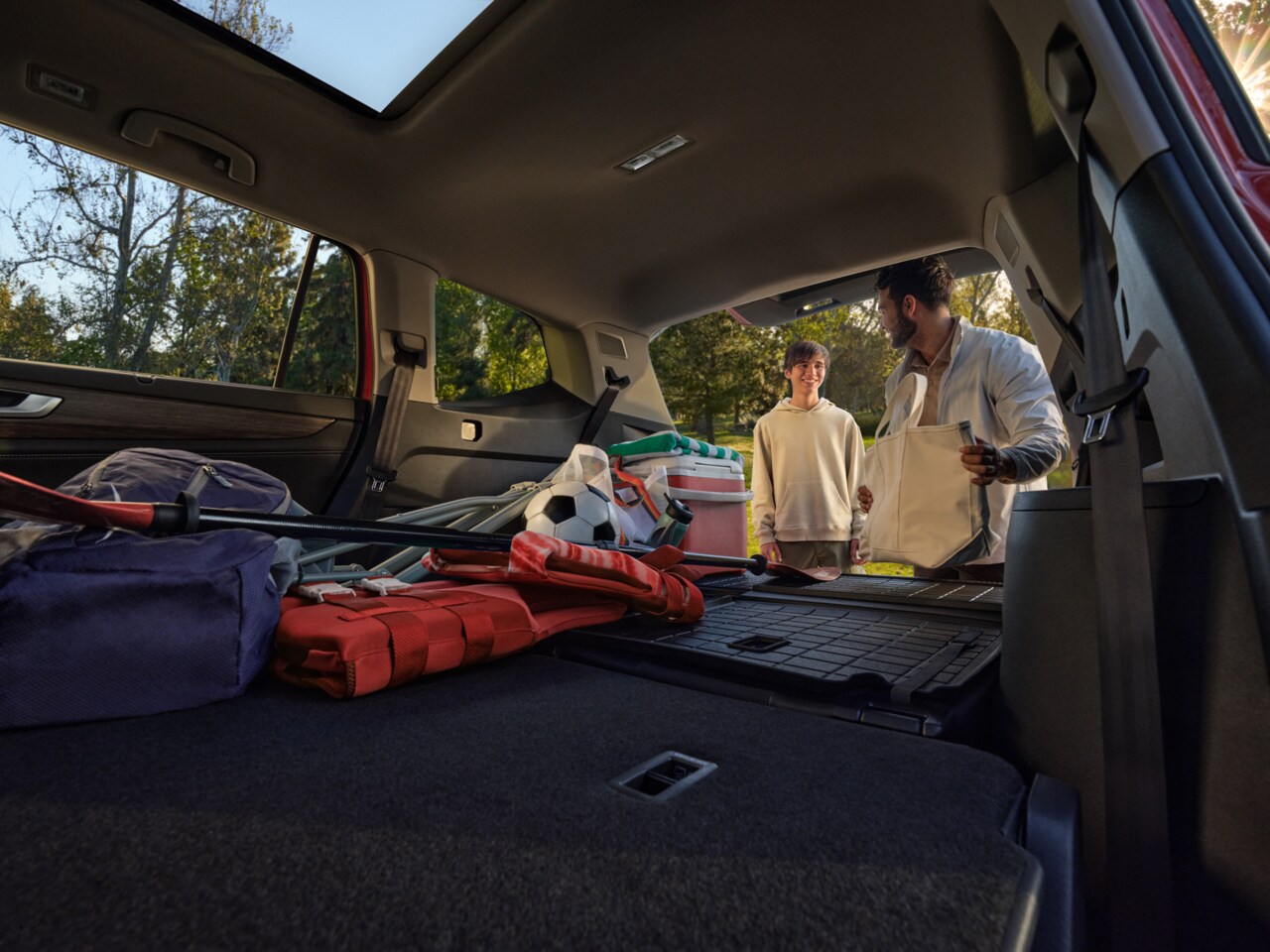 Inside the 2026 Atlas, you'll find a refined sanctuary with seating for up to seven passengers. Heated and ventilated front seats wrapped in perforated leather offer all-day comfort, while the second row features captain's chairs for easy access to the third row. Tri-zone automatic climate control keeps everyone cozy. Generous cargo space, up to 96.8 cubic feet with the seats folded, lets you bring along everything you need for a family outing in Vermillion.